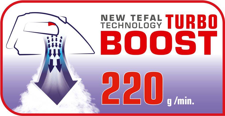 Žehlička TurboPro je vybavena novou patentovanou technologií Tefal Turbo Boost pro vytvoření parního rázu, který pronikne hluboko do látky, aby odstranil i nejodolnější záhyby. Se sběračem vodního kamene pro dlouhodobě vysoký výkon páry nabízí tato vysoce účinná napařovací žehlička každodenně rychlé a bezchybné výsledky žehlení.