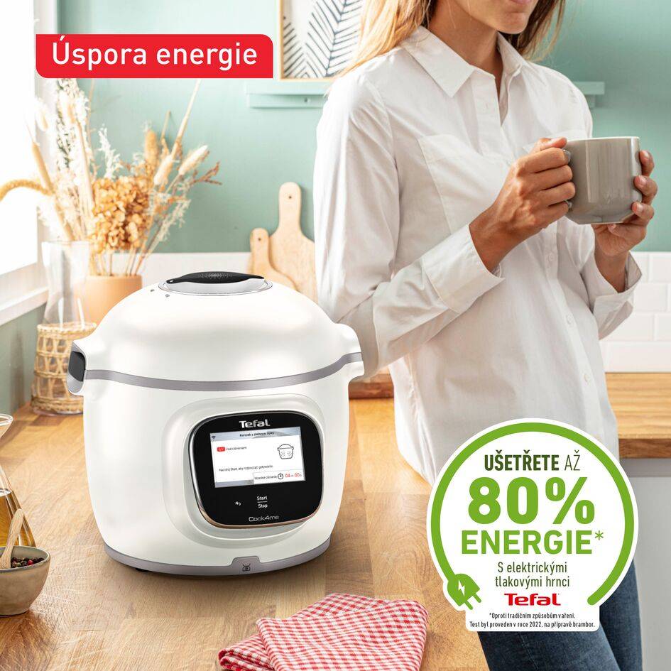 Zdravá a chutná jídla rychle na vašem stole díky našemu nejrychlejšímu a nejchytřejšímu multifunkčnímu hrnci Už žádné odměrky, díky vysoce přesné integrované váze, která snadno odváží ingredience přímo v nádobě během vaření Neomezený přístup k bezplatným receptům díky WiFi připojení v aplikaci Tefal pro rozmanitou každodenní přípravu pokrmů Recepty doporučené na základě vaší chuti, předchozího vaření a surovin, které máte právě doma Dokonalé výsledky a snadná příprava díky pokynům krok za krokem pomocí fotografií a videí zobrazovaných na velké dotykové obrazovce Šetří čas a energii: Vysokotlaká technologie umožňuje vařit až 6krát rychleji* a ušetřit až 80 % energie Nechte multifunkční hrnec Cook4me řídit vaření za vás, abyste nemuseli nic hlídat Kvalita podpořená naší 15letou zárukou opravitelnosti pro ochranu životního prostředí a snížení množství odpadu