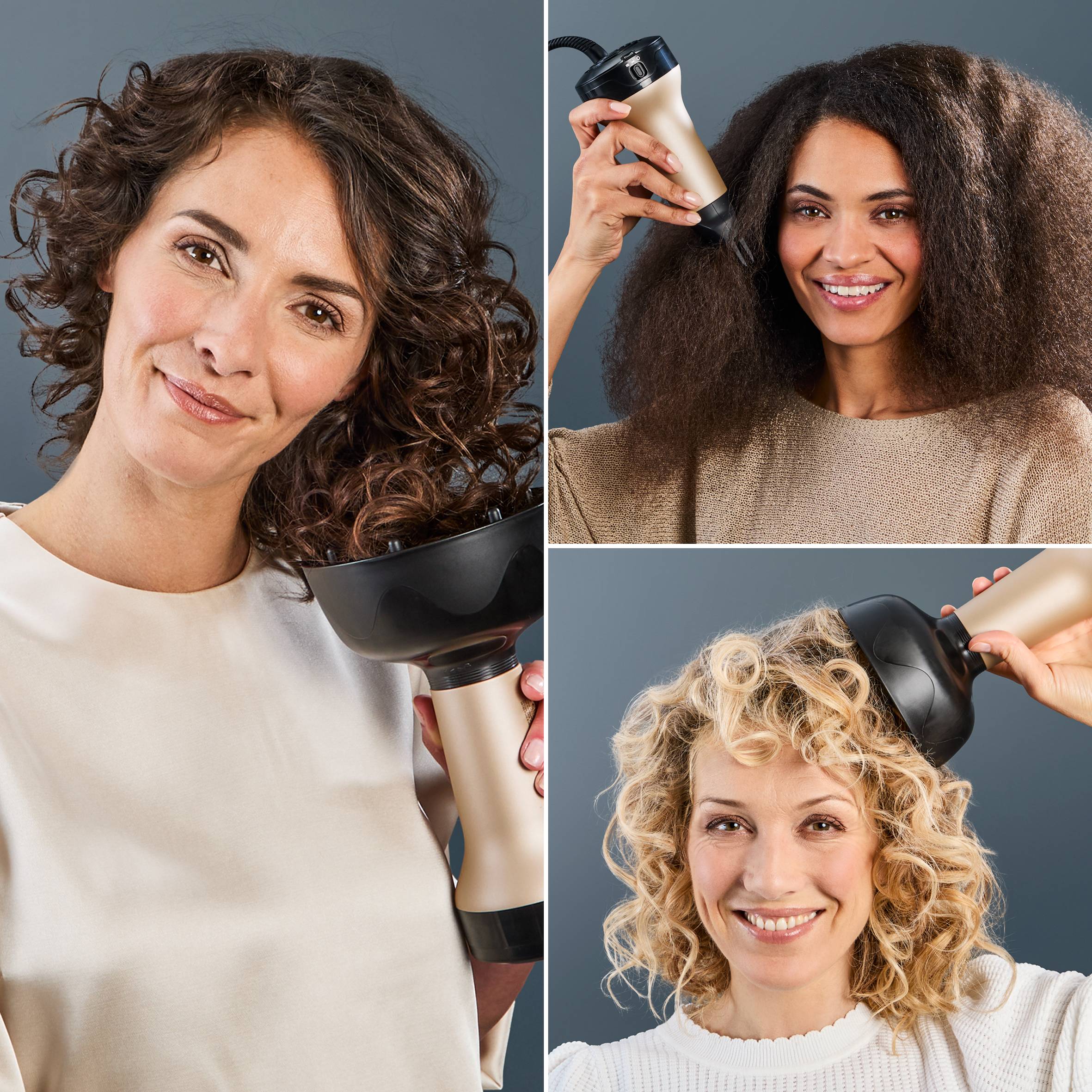 Horkovzdušný difuzér Rowenta Curl Harmony 3v1 urychluje vysoušení vlasů u 94 % žen*** a zároveň definuje a zdokonaluje přirozenou krásu vašich kadeří Užijte si dokonalé účesy díky 3 stylingovým nástavcům a ideálnímu nastavení pro zvýrazněné kadeře s dvakrát menším krepatěním***, pro péči, která simuluje přirozené vysoušení, s jemným prouděním vzduchu a bez nadměrného tepla.