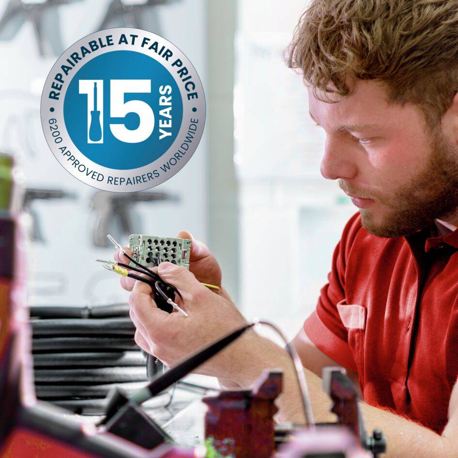 Výhody opravitelnosti a odolnosti produktu se týkají všech. Jedním z našich hlavních cílů je boj proti odpadu, a proto se zavazujeme uchovávat náhradní díly po dobu 15 let k zajištění účinné opravy vašeho produktu za férovou cenu. Naše síť 6200 schválených servisních center po celém světě vám pomůže v případě rozbití nebo malého problému s funkčností. Hledejte vyhrazené logo pro opravitelnost na vybraných produktech a zažijte jednoduché a rychlé opravy!