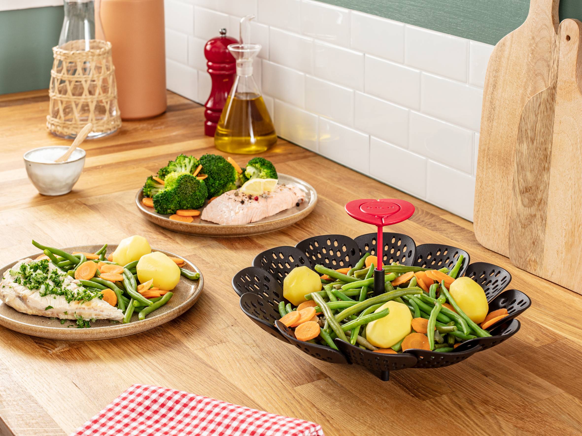 Všestranný napařovací koš, který se přizpůsobí jakémukoli nádobí a díky složení se snadno uskladňuje Vyrobený pro použití při teplotách až do 230 °C – pro všechny vaše každodenní potřeby při vaření Kuchyňské příslušenství vhodné do myčky pro snadné čištění a mimořádně praktické každodenní použití Vyrobeno v souladu s normou kvality Tefal, na základě intenzivního testování v laboratoři před uvedením na trh.