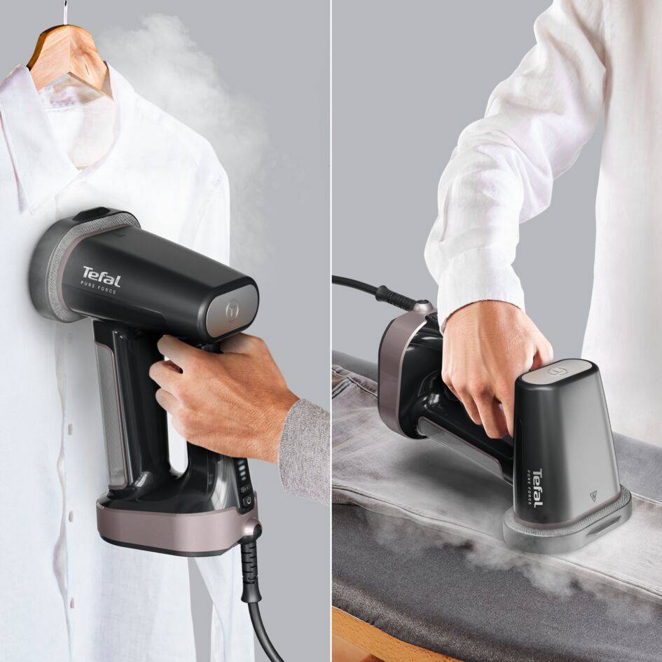 TEFAL Pure Force je řešení 3v1 pro žehlení, napařování a odstraňování žmolků a prachu z vašich oblíbených oděvů. Díky inovativní konstrukci umožňuje snadný přechod mezi horizontálním žehlením a vertikálním napařováním. Díky systému oboustranného nástavce snadno odstraňuje žmolky a mikročástice prachu, zatímco jemným tkaninám dodá svěžest. Využijte celou řadu vylepšených funkcí pro bezkonkurenční péči o oblečení.