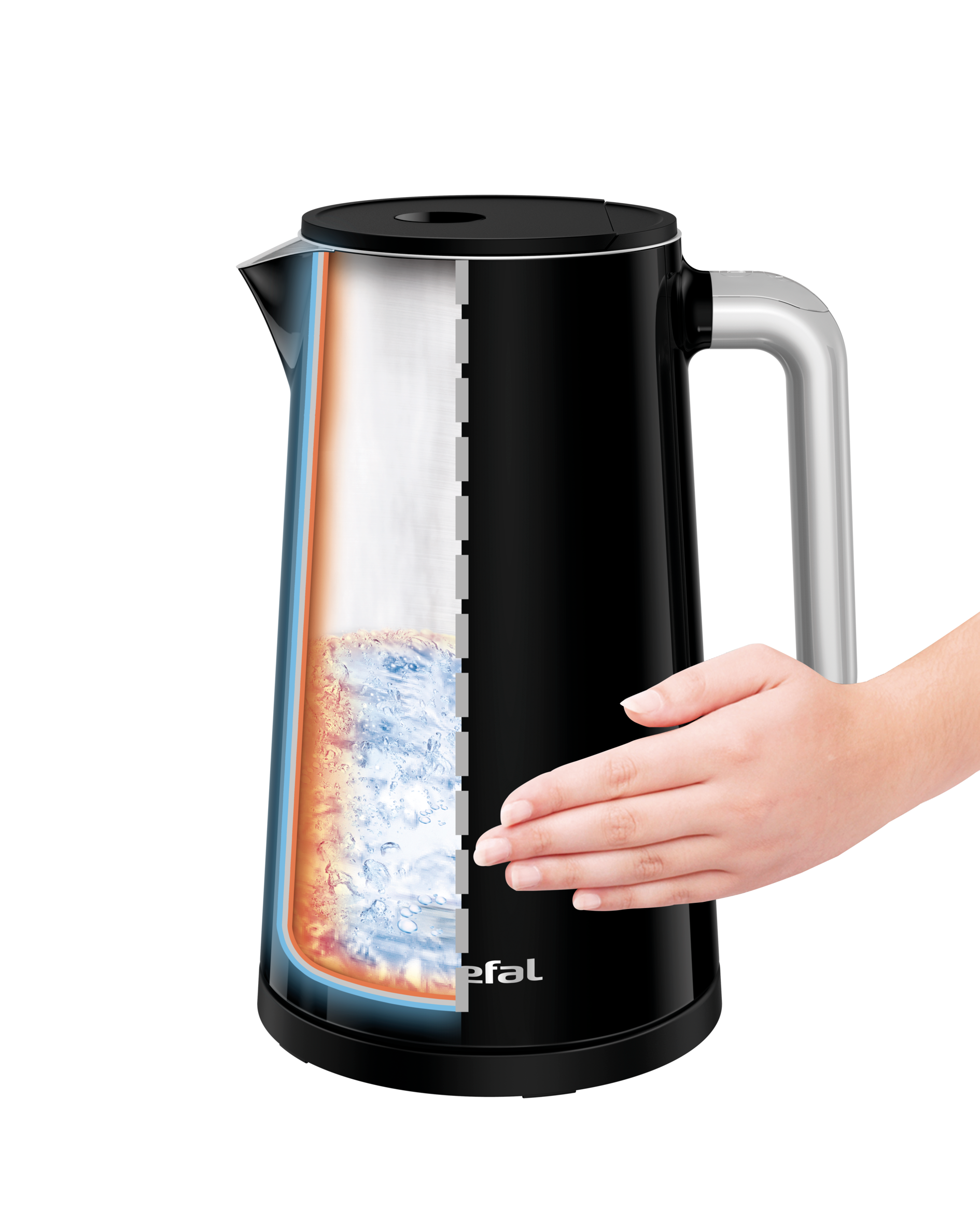 Nepropustný povlak zabraňuje zahřívání vnějšího pláště konvice a zůstává chladný i během varu vody. Od této chvíle budete moci bez obav připravovat dokonalé horké nápoje díky speciálně navrženým dvojitým stěnám.