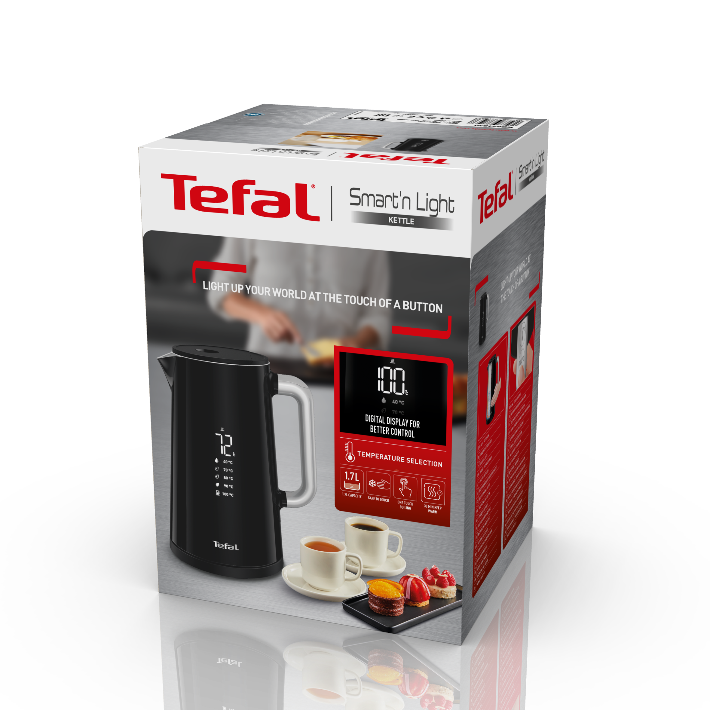 Vychutnejte si horké nápoje se správnou teplotou, dokonale přizpůsobené vaším požadavkům s rychlovarnou konvicí Tefal - moderní a intuitivní konvice s regulací teploty, která je rafinovaná a pokroková zároveň. Tato rychlovarná konvice je vybavena přehledným minimalistickým digitálním displejem, který zobrazuje teplotu vody v reálném čase. Nabízí výběr z pěti nastavení teploty od 40 do 100 °C – ideální pro ohřev vody jediným stiskem tlačítka. Její konstrukce s dvojitou stěnou udržuje teplo uvnitř a zároveň zajišťuje, že vnější část konvice zůstává na dotek chladná a tím i zcela bezpečná. Mezi další užitečné funkce patří funkce udržování teploty po dobu 30 minut, automatické otevírání víka pro snadné plnění, rotační základna o 360° a automatické vypnutí pro používání bez starostí. Díky velkorysé kapacitě 1,7 l můžete navíc připravit až 7 šálků najednou. Čištění usnadňuje odnímatelný filtr na vodní kámen.