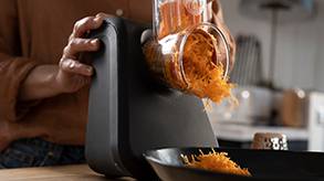 Díky elektrickému strouhači Eco Respect je příprava zeleniny jednodušší než kdy předtím! Elektrický kráječ a strouhač Eco Respect od značky Tefal má jednoduchý systém barevně odlišených nástavců a uspokojí všechny vaše potřeby při přípravě zeleniny v podobě jednoho uživatelsky přívětivého přístroje. Strouhání, krájení a drcení k dokonalosti s výjimečnými výsledky u všech vašich oblíbených receptů a ingrediencí: zelenina, ovoce, sýr, čokoláda a další - pro recepty jako jsou čerstvé a lahodné krouhané saláty, chutné zeleninové placičky a křupavé bramboráky, které se vždy dokonale povedou. Velký plnicí otvor znamená méně krájení ingrediencí před vkládáním, s designem pro snadné čištění a skladování. Tento strouhač s ekologickým designem je dokonalý doplněk, který je atraktivní a kompaktní a skvěle se hodí do každé kuchyně.
