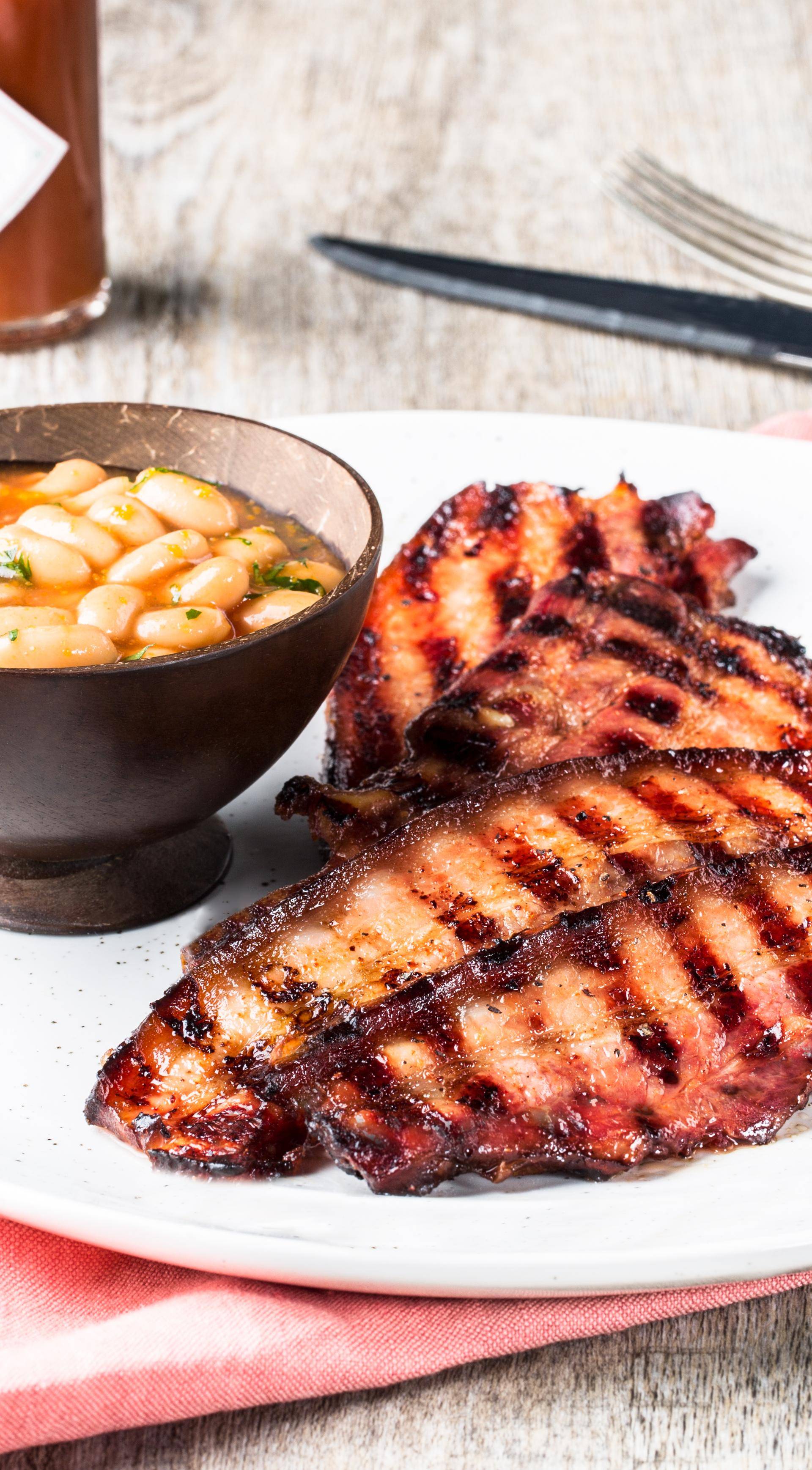 Vložte grilovací mřížku do přístroje a předehřejte ji v programu GRILL po dobu 15 minut při teplotě 200 °C. Maso osolte a opepřete a vložte na 2 minuty do varné nádoby. Maso otočte a potřete směsí. Pokračujte v pečení další 2 minuty a pak podávejte.
