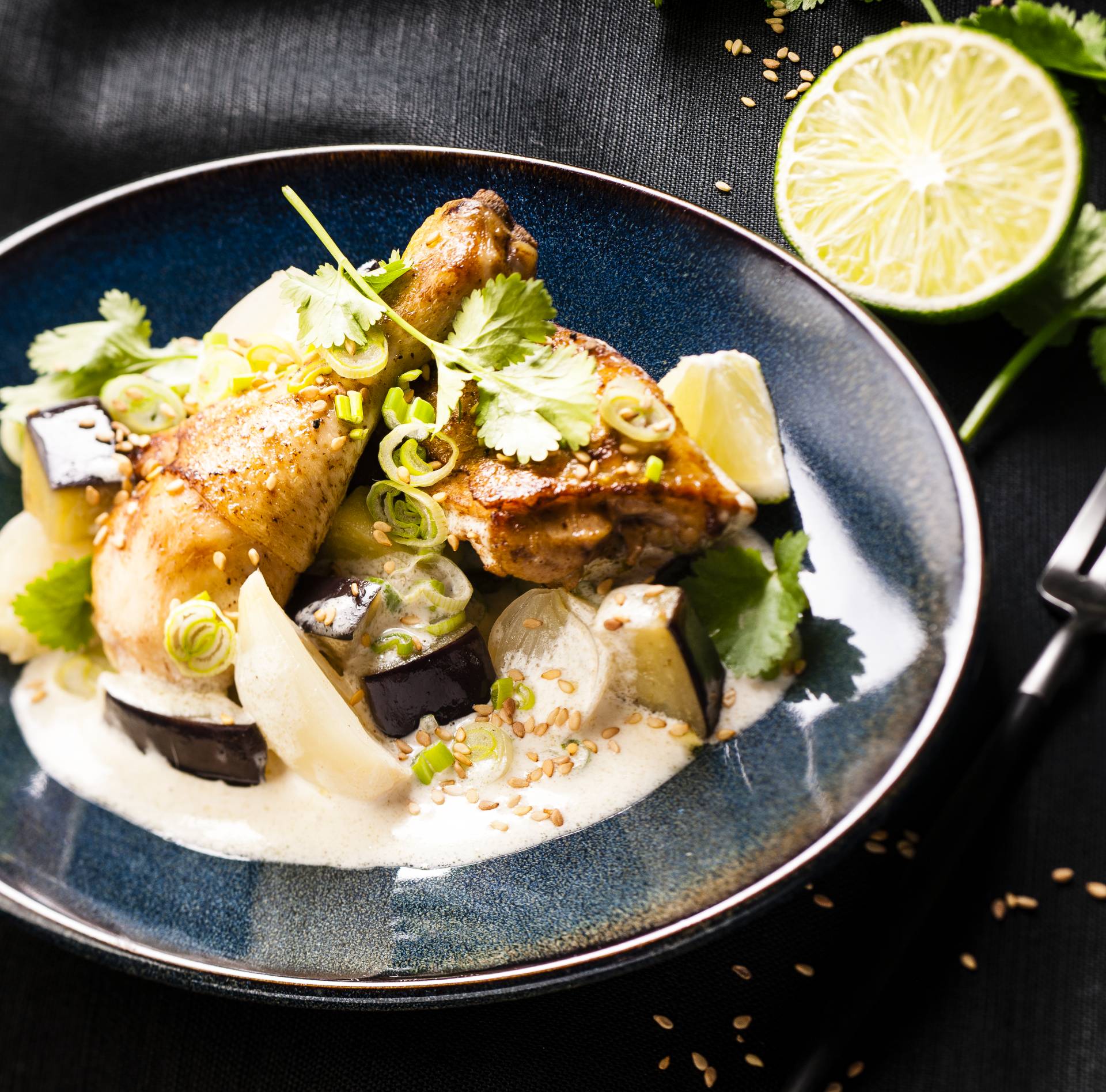 Vložte cibuli a kuře zpět do nádoby. Přidejte šťávu z marinády, kokosové mléko a lilek.