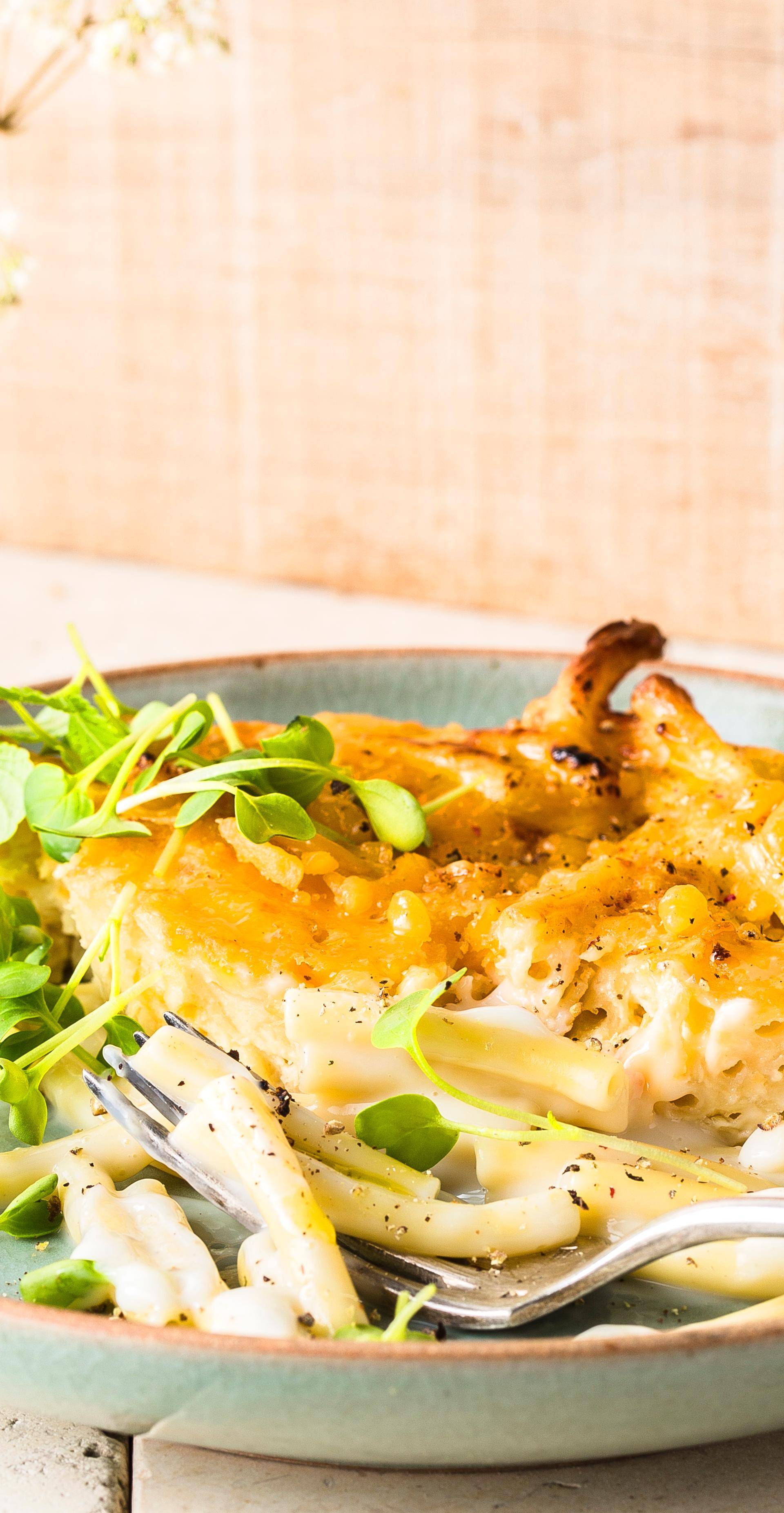 Přidejte hořčici a crème fraîche. Smíchejte. Posypte sýrem.